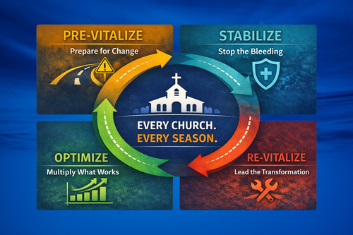 Through The Revitalized Church, Will has developed a unique four-stage framework — Pre-Vitalize, Stabilize, Re-Vitalize, and Optimize — designed to meet churches where they are and guide them forward with wisdom, compassion, and practical tools.